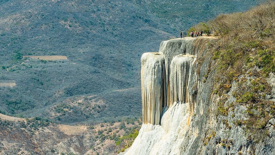 Такое чудо света, как великолепный природный объект можно увидеть в Мексике. Это Иерве-эль-Агуа (Hierve el Agua, который издалека выглядит, как большой, полноводный водопад. Но, когда подойдешь ближе, видно, что это не струйки воды, бегущие по склону холма, а нечто совсем иное. Большая часть дорожки к нему и сам водопад - это естественное каменное образование, в некотором роде похожее на турецкий Памуккале. В переводе с испанского Иерве-эль-Агуа означает «кипящая вода», но водопад больше напоминает замерзшую воду. Иерве находится в 70 км от города Оахака (Oaxaca) одноименного штата, население которого около двух тысяч человек. По дороге к «водопаду» в двух выступах находятся источники пресной воды. Однако вода в них насыщена минералами, а именно карбонатом кальция. Он содержится в скальной породе по всему миру, и также является основным элементом морских раковин, жемчуга и раковин улиток. Вода из этих источников «стекает» по склону горы, образуя белые скалы, издалека похожие на водопад