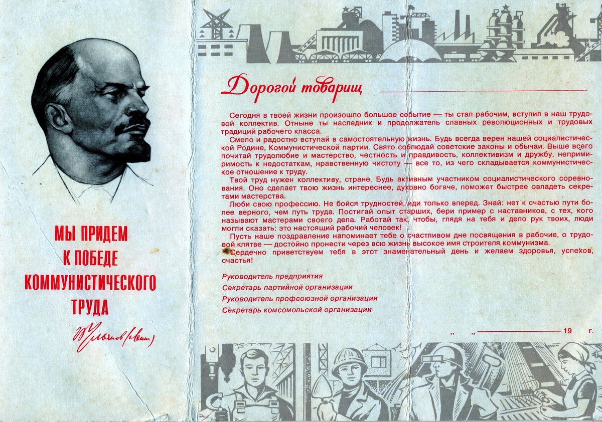 Обычно в актовом зале какого-либо завода собирались молодые ребята вместе со своими наставниками. Звучали напутственные речи. Каждому молодому рабочему торжественно вручали удостоверение о присвоении разряда, первую получку, особо отличившимся - диплом и какой-нибудь подарок. Молодые рабочие подписывались под словами клятвы рабочему классу в заводской книге «Посвящение в рабочие» (была и такая на ремонтно-инструментальном заводе).