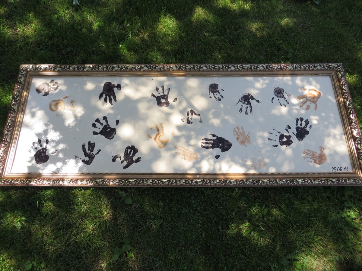 Наша бабушка затеяла ремонт и привезла из своих «закромов» рамку для картины и подрамник. Долго она лежала у нас в сарае без дела... Но вот мужу пришла идея, покрасить подрамник краской и сверху налепить детские картины, но дети предложили украсить её своими ладошками. Пятилетняя дочка прекрасно справилась, а вот с маленькой пришлось непросто, ей тяжело было не шевелить рукой по картине, она так и норовила провести по ней ладошкой. В общем, неплохой получился бабушке подарок.