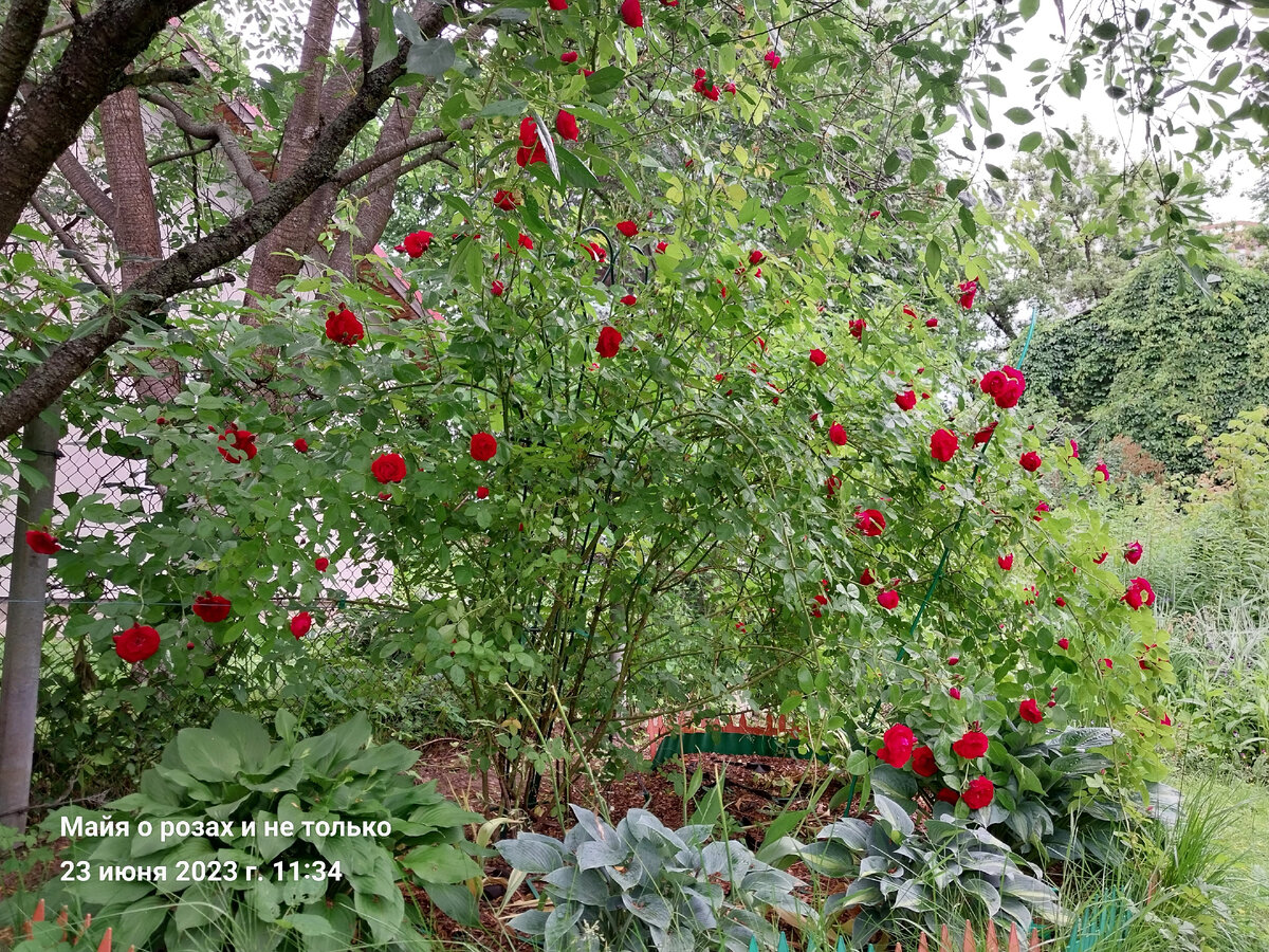 Наши сады с Мариной разные как земля и небо, лёд и пламя! И это просто замечательно! Когда мне хочется много воздуха и простора, я просто открываю калитку и попадаю в параллельную реальность. Всё, что невозможно посадить в моём маленьком рафинированном саду, раскинулось и благоухает на соседских сотках. Начало рассказа в этой статье ⬇️ Сегодня пасмурно и дождь, погода позволила взять выходной. Я вытащила Марину из дома и мы пошли делать обход её сада. Друзья, мы не знаем названия сортов НИЧЕГО, или почти ничего, поэтому даже спрашивать не стоит. Просто гуляем и наслаждаемся природой. Первое, что привлекло моё внимание- это форма и размеры розы Фламментанц. Обычно деревья подавляют розы, а тут наоборот- Фламментанц подчинила себе вишню и использует её для себя любимой в качестве опоры. Когда вы сажаете маленький саженец этой розы, учитывайте её размеры в будущем! Раз начали про розы, то и продолжим про них. Помните, я рассказывала, что поделила старые корни привитых роз Ангела и Паст