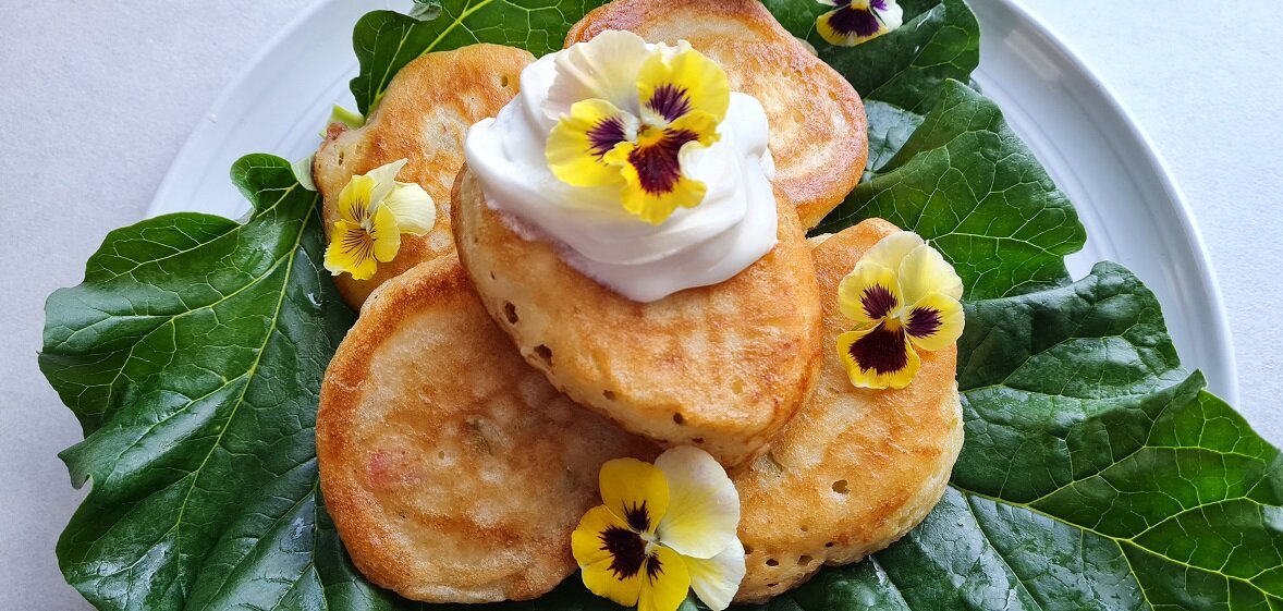 Сезон ревеня уже идёт, и поэтому блюда с ним – частые гости на нашем столе. В прошлом сезоне я уже делилась рецептом шарлотки с ревенем, теперь расскажу про необычные оладьи с этим овощем. Если у вас нет ревеня, не расстраивайтесь! Можно приготовить по этому же рецепту с яблоками или вообще без начинки. Важно соблюдать пропорции и все нюансы технологии приготовления, чтобы оладьи получились пышные, вкусные. Если будете готовить без начинки, кладите муки меньше на 2 столовые ложки. Вам понадобится: — кефир или простокваша – 1 стакан (у меня всегда гранёный); — яйцо свежее – 1 штука; — сахар – 1 столовая ложка; — соль – 0,5 чайной ложки; — мука белая – 1 стакан и 2 столовые ложки с горкой среднего размера; — сода пищевая – ½ чайной ложки; — ревень – 50 граммов; — масло растительное для жарки – примерно 1,5 стакана. Сначала подготовьте ревень. Его нужно промыть (я не чищу), порезать маленькими кусочками толщиной 3-5 миллиметров. Я стараюсь использовать тонкие молодые черешки. Взбейте слег