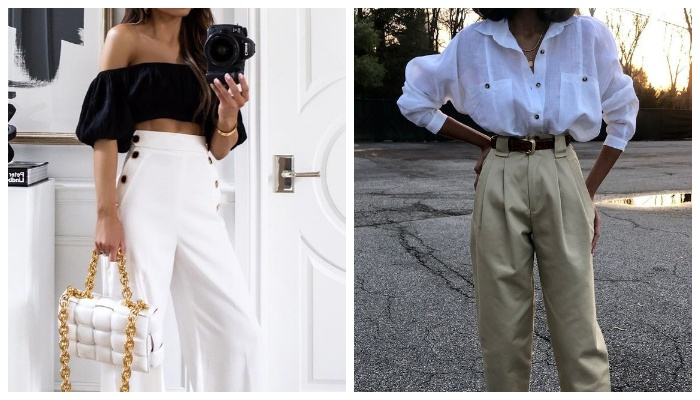 Тренд на брюки с высокой посадкой с каждым новым сезоном становится все более и более актуальным. Прямо сейчас гуру моды покажут на конкретных примерах, как могут выглядеть стильные аутфиты с брюками с высокой посадкой летом 2023 года. Перед вами эффектный городской look, который включает в себя модные брюки, белоснежную майку, объемный жакет, слингбэки и сумку контрастного коричневого цвета. Трендовые кожаные брюки черного цвета + белый трикотажный топ с сексуальным вырезом в зоне декольте + остроносые туфли, украшенные стразами + каркасная белая сумка с коротким ремешком — look с определенной изюминкой. Модные брюки из цветной кожи с разрезами шикарно смотрятся с белыми кроссовками и светлым укороченным лонгсливом. Перед вами наглядный пример кэжуал образа, который включает в себя кожаный жакет, черный топ, белые спортивные брюки, белую бейсболку, громоздкие белые кроссовки и объемную кожаную сумку черного цвета с короткими ручками. Черный топ с воланами + эффектные белые брюки клеш