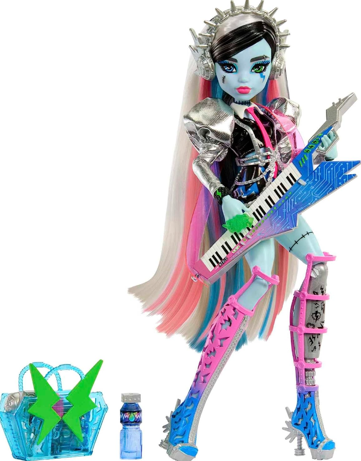 Новинка 2023 года - Френки Штейн в образе рок-звезды! У куклы очень (на мой взгляд) интересный образ. Пышные серебряные рукава, шорты с синими молниями из искусственной кожи, также у куклы портупея из имитационной цепи, длинные открытые ботинки с градиентом от розового к голубому цвету, а каблук в виде болтика цвета металлик. Для меня она максимально крутая в этом образе! Много аксессуаров идут с куклой, яркий розовый галстук, массивное зеленое кольцо с надписью ZAP, сережки-гвоздики, черный браслет с зеленой молнией. У Френки большая полупрозрачная голубая сумка с двумя зелеными молниями. Также наушники с шипами цвета металлик. Самая интересная деталь - гитара, она также в цвет градиента от голубого к розовому. Ее можно надеть на куклу, держаться будет с помощью розового ремня. Помимо всего у куклы для выступления есть фен для волос, лак-фиксатор (с крышкой которую можно будет снять), черное зеркало, голубые заколки, телефон, бутылочка, зеленая расческа в виде молнии. Стоит и рассмот