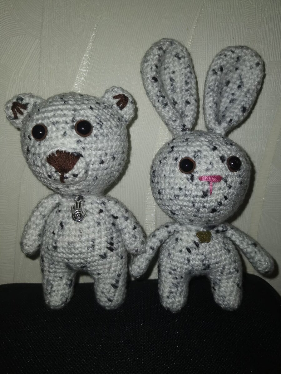 Друзьяшки - просто потому что вяжутся по одной схеме, кроме ушей и оформления мордочки, и у меня они вязались из одинаковой пряжи. При описании Мишки, я говорила, что накосячила с Зайкой. Туловище у него должно быть, как у Мишки, но я, видимо, отвлеклась и от меня убежали ряды с 6-го по 11-й, т.е. я после "Попкорна" сразу перешла к убавкам 12-го ряда 🤦♀️ Материалы и инструменты, которые использовала я: