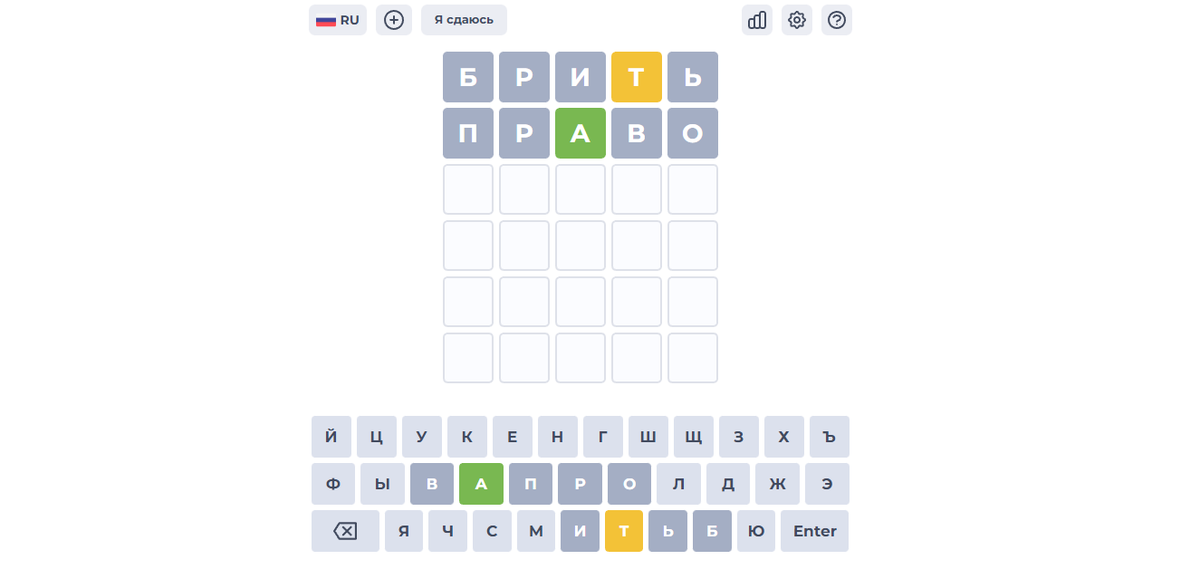 Если хотя буква в вашем слове соответствует задуманному — она подсветится зелёным если в нужной позиции, если не в нужной позиции она подсвечивается желтым. Это такой кроссворд с динамической подсветкой правильных результатов. А вот если во введённом слове все буквы выделены серым цветом, значит вы ошиблись со всеми буквами.