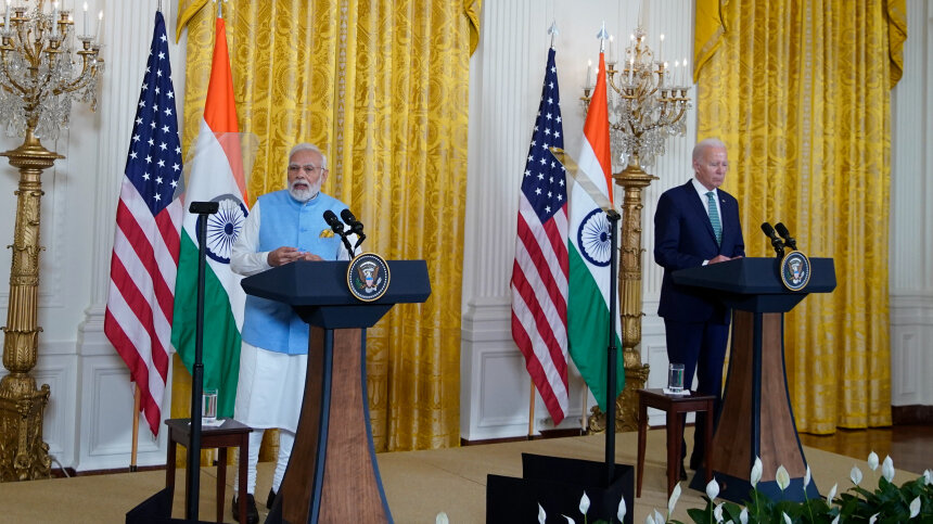 Страны, считает он, должны сделать все возможное для решения ситуации. Фото: www.globallookpress.com / Al Drago - Pool via CNP; 5-tv.ru Премьер-министр Индии Нарендра Моди заявил, что страны мира должны сделать все возможное для остановки украинского конфликта. С таким призывом он выступил на совместной пресс-конференции с Джо Байденом в Белом доме. По словам Моди, главным инструментом должна стать дипломатия. «Украинский конфликт затронул большинство стран, особенно страны глобального Юга. Мы считаем, что для решения этих проблем абсолютно необходимо, чтобы все государства объединились в своих усилиях. Индия изначально делала упор на разрешение спора путем диалога и дипломатии», — сказал политик. Этот визит запомнится нелепым поведением хозяина Белого дома. Сначала Байден приложил руку к сердцу во время исполнения гимна Индии, приняв его за американский. Затем — в обращении к Моди — перепутал его должность и назвал президентом. А после и вовсе схватил премьер-министра за руку во время