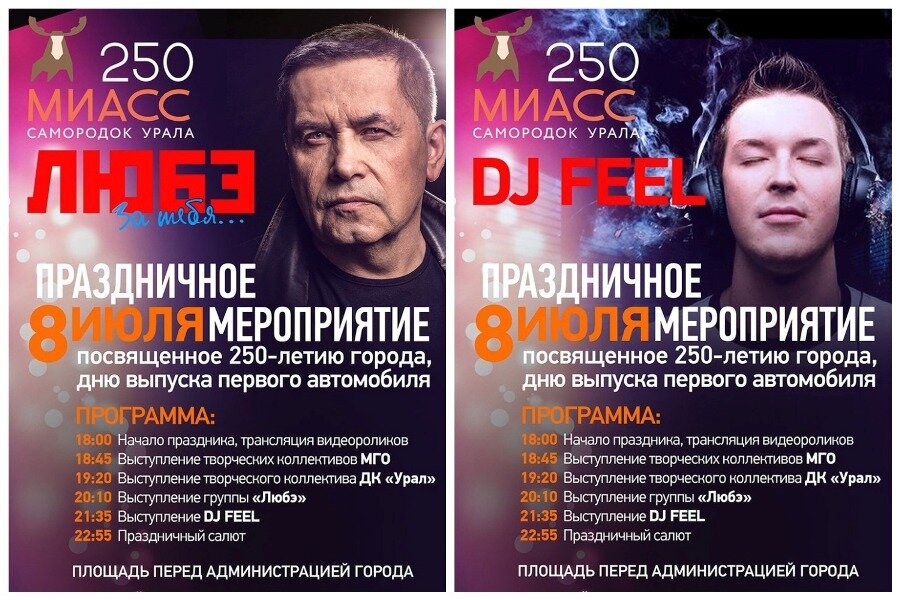 Праздник пройдет 8 июля на площади перед городской администрацией. Он стартует в 18.00 с показа праздничных видеороликов и других «разогревочных» мероприятий. А с 18.45 начнется концерт. Сначала перед зрителями выступят местные творческие коллективы, а в 20.10 на сцену должны выйти приглашенные гости, группа «Любэ». После них также пройдет выступление DJ FEEL, оно ориентировочно начнется в 21.35, но всегда нужно помнить, что в программе могут быть небольшие заминки. Завершится праздник торжественным фейерверком. Он должен прогреметь над городом с 22.55. Напомним, что в прошлом году в Миасс с бесплатным концертом приезжал Леонид Агутин. Во время выступления на сцену пробрался один из зрителей. Подойдя к Агутину мужчина, видимо, рассчитывал на одобрительный жест певца, но в ответ получил мощный отпор. Не увидев одобрения кумира, фанат сам спустился на землю, где его уже ждали охранники.