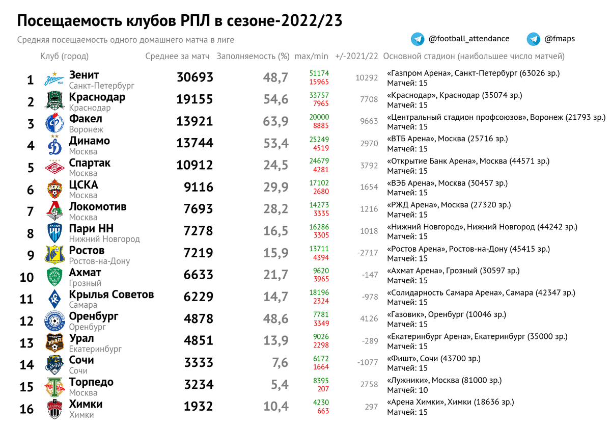 В топ-3 также попали ещё два клуба не из Москвы. К «Краснодару» в числе самых посещаемых клубов лиги мы уже привыкли: «быки» 7-й сезон подряд в топ-5 по домашней посещаемости в РПЛ, и второй сезон подряд — на втором месте после «Зенита».