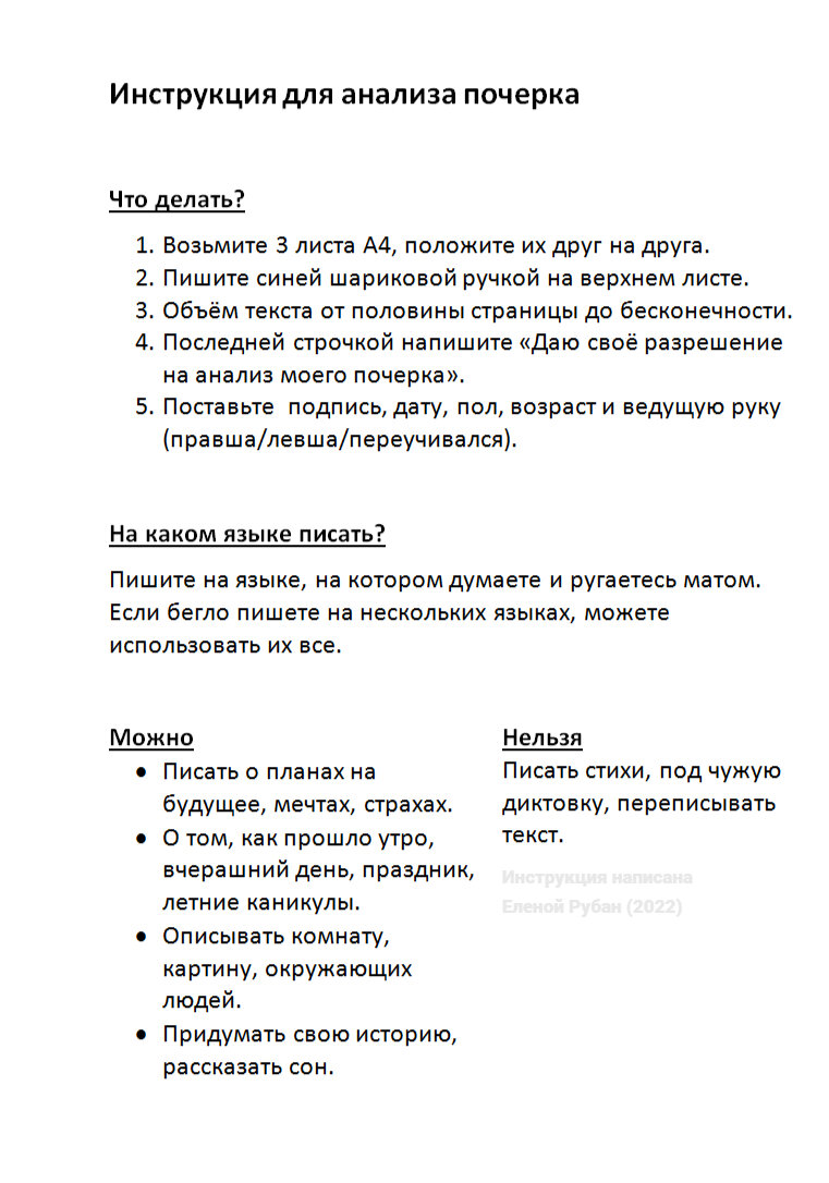 Почему в инструкции для анализа почерка так много требований? Давайте разбираться! Каждое требование влияет на качество графологического анализа. Три листа = 1 лист для письма + 2 листа "подложки", которая поможет избежать дрожаний линии из-за твёрдой неровной поверхности стола. Синяя шариковая ручка точнее показывает перепады нажима и изменение линии, чем цветная и/или гелевая ручки. Белый лист символизирует пространство человеческой жизни, а написанный текст показывает, как человек в этом пространстве адаптируется. Чем больше текста, тем графолог лучше понимает особенности адаптации клиента. Разрешение на анализ даёт графологу право анализировать текст и показывает готовность клиента к консультации. Подпись имеет своё психологическое значение — показывает социальную роль клиента, тот образ, который он транслирует во внешний мир. Подпись может вытекать из характера или отличаться от него. Ведущая рука влияет на трактовку наклона буквы: у левшей мы автоматически поворачи