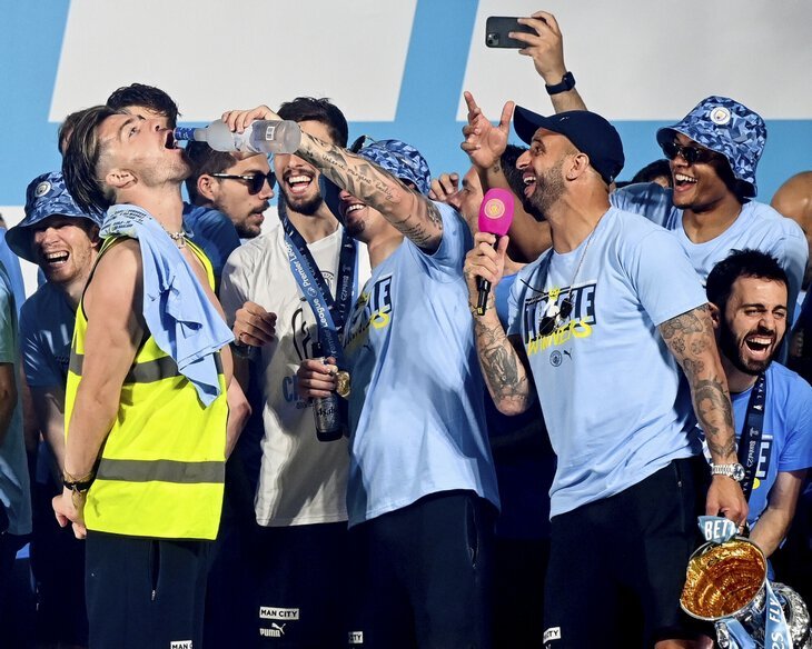 Фото Грилиша с парада «Сити» войдет в историю. И вот почему Угадайте: пьет футболист или нет Грилиша накачали пивом и водкой, Холанд облил шампанским. Парад «Сити» – главная туса лета