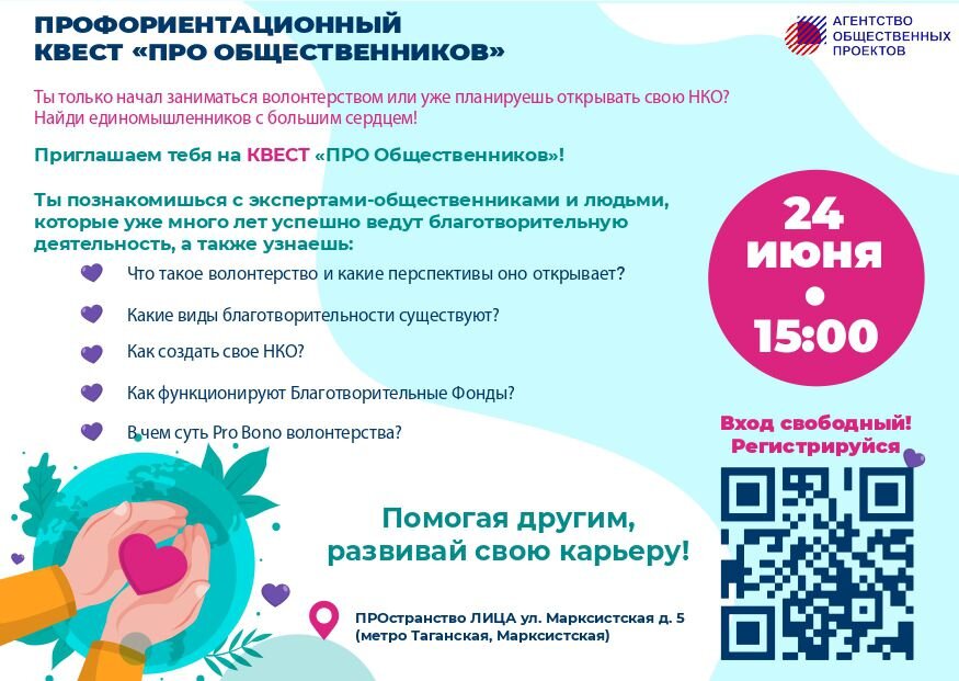 В субботу пройдет специальный познавательный профориентационный квест "ПРО общественников", который организуется Московским агентством реализации общественных проектов для активной молодежи Москвы.