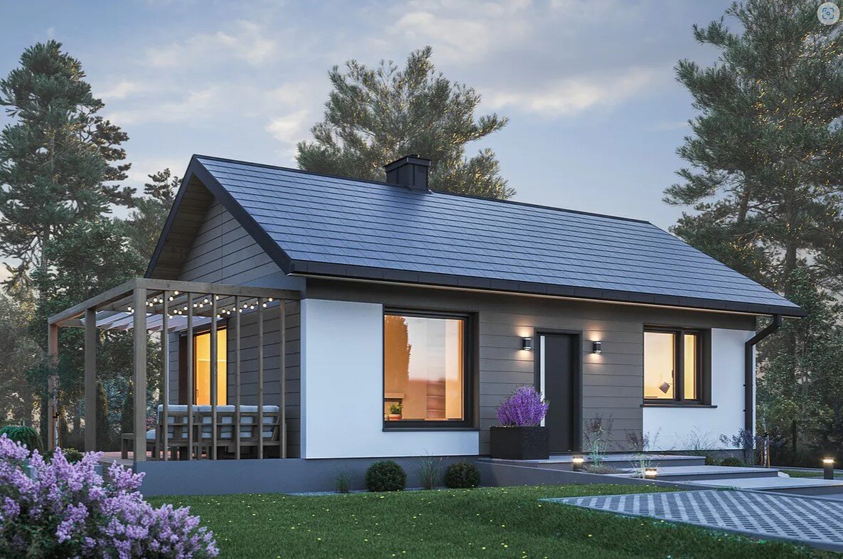 В планировке дома разместились две спальни, кухня-гостиная с выходом на террасу, а также санузел с прихожей. В доме не предусмотрено отопление газом, поэтому бойлерной в доме не размещено, всё необходимое оборудование можно разместить на кухне или в санузле. Материалом стен в доме служит теплая керамика толщиной 380мм, 250 мм - внутренняя несущие, 120мм - перегородки. Кровля в доме двускатная с покрытием мягкой битумной черепицей. Внешняя отделка в доме - штукатурка и панели под дерево. На террасе предусмотрен пергальный облегченный деревянный навес. - Общая площадь - 53 м2