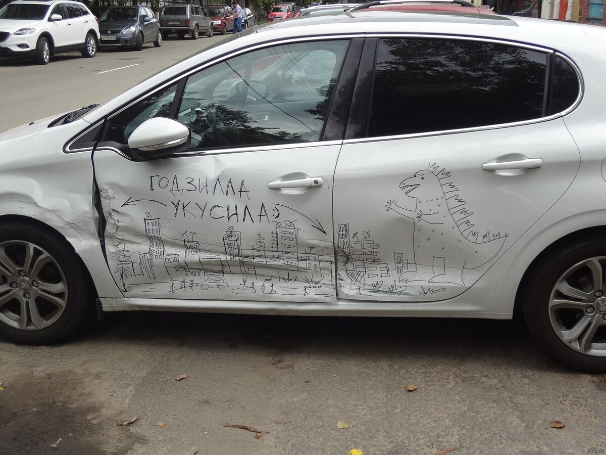 Во времена Советского Союза на автомобили тоже наносились надписи. Правда в то время даже никто и думать не мог, чтобы они были смешными и нелепыми. И в основном надписи наносились только на автомобили служб быстрого реагирования. То есть скорая помощь, газовая служба и другие. Сейчас же надписи на автомобили наносят все, кому не лень. При чем кто-то таким образом пытается продвинуть свой бизнес, кто-то призвать к справедливости. Некоторые с помощью надписи пытаются украсить свой автомобиль или даже скрыть с их помощью какие-то небольшие дефекты на кузове. А кто-то просто самому повеселиться и рассмешить окружающих людей. Давайте посмотрим какие все-таки смешные надписи автомобилисты наносят на свои автомобили. Фотографии смешных надписей на автомобилях. 1. Это не водитель, а настоящий художник. Судя по фотографии у него не плохая фантазия и хорошее чувство юмора. Даже несмотря на то, что он оказался в не очень-то и приятной ситуации. 2. Если надпись на автомобиле подкреплена картинко