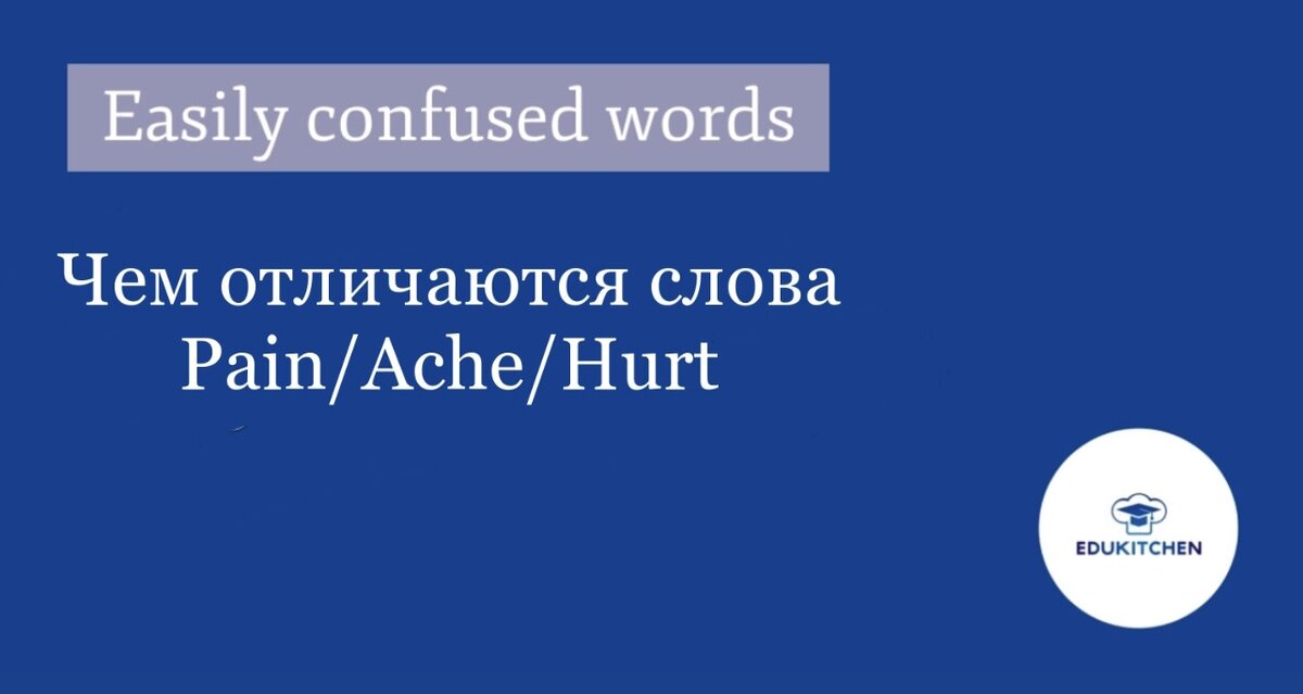 Pain Значение: (noun) is something external; may come on quickly and it is more difficult to ignore нечто внешнее; может наступить быстро, и его труднее игнорировать Пример: When you receive an injection, there is a pain as the needle goes in. Когда вы получаете инъекцию, возникает боль при введении иглы. Ache Значение: (noun) is something internal; a persistent physical discomfort, typically dull (a toothache) нечто внутреннее; постоянный физический дискомфорт, обычно тупая (зубная боль) Пример: If you have a headache, take a tablet. Если у вас болит голова, примите таблетку. Hurt Значение: (verb) to feel pain; to accidentally cause pain or injury (can be emotional pain as well as physical pain) чувствовать боль; случайно причинить боль или травму (это может быть эмоциональная боль, а также физическая боль) Пример: I was running in the park and I hurt my leg. Я бегал в парке и повредил ногу. Если статья была полезной - не забудьте поставить лайк, написать об этом в к