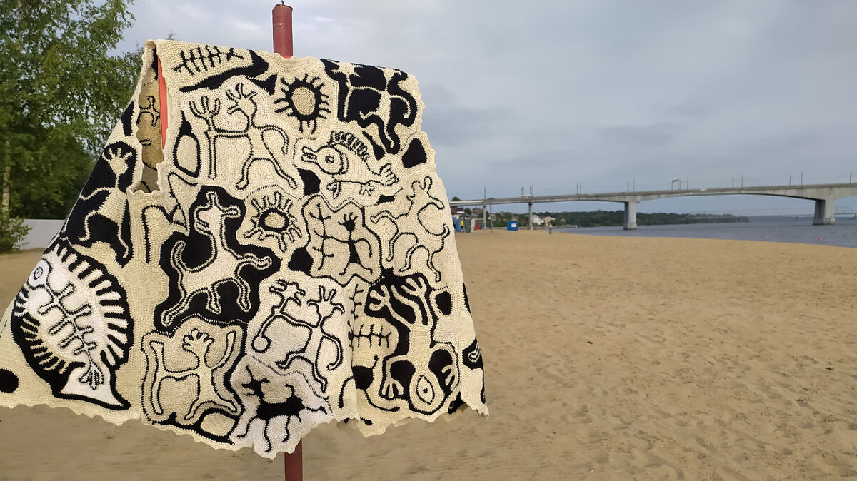 Меня тянуло на берег словно пароходик канатом к причалу. Накрапывала микроскопическая сырость. Ладошка щекотно предвкушала добычу. Наверное, найду кривую коряжку, обглоданную донными камнями и оглаженную береговым прибоем. Ну, пошла. И нашла, но иное сокровище, о нëм чуть позже. Сначала показываю ангела в домике жилета: А теперь вернëмся к началу пути. Оставив музейную службу до завтра, я отправилась на променад. Флористика костромских улочек: Вот он, берег. Пляж со свеженастеленным, граблями причëсанным песочком. Бросила суму свою перемëтную и пошла сокровища искать. Водоросли есть, но не факт, что их можно есть. В детстве я из таких зелëных гирлянд делала юбки, парики и вообще любую русалочью одежду. Кто как я? Хотела я, как обещала, сфотографировать все мотивы вязаного жилета. Но успела только рыбу. Погода тучно нахмурилась и пригрозила дождиком, пришлось эвакуироваться. Фотосессия переносится. И про чуточку подросшую обложку петербургского блокнота я не рассказала...