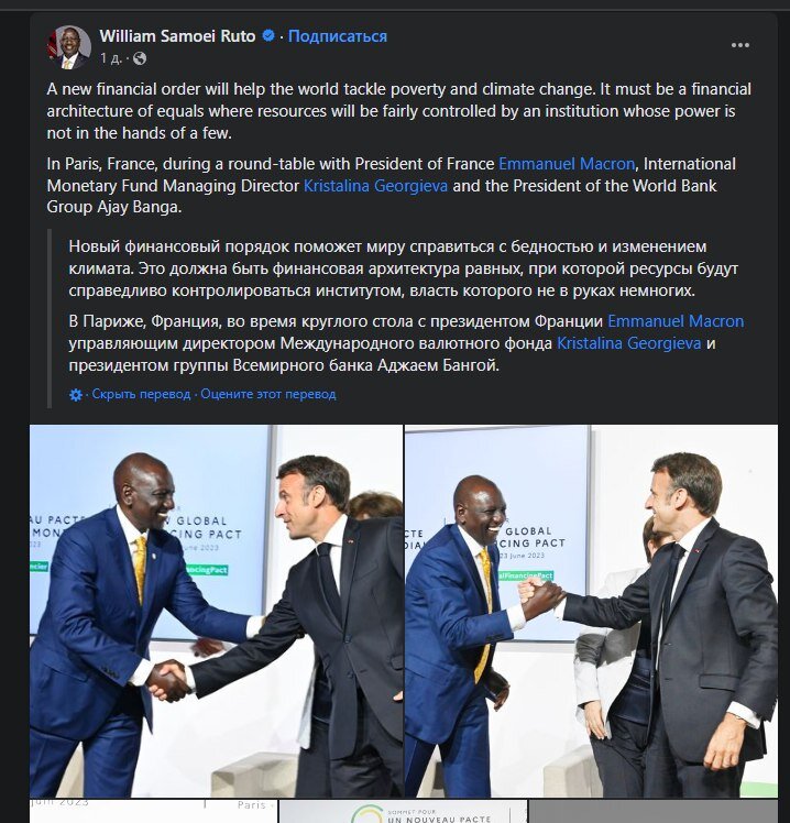 Президент Кении Уильям Руто на встрече с Э.Макроном и директором МВФ Кристалиной Георгиевой заявил о необходимости "нового финансового порядка", который представляет собой "финансовую архитектуру равных, при которой ресурсы будут справедливо контролироваться институтом, власть которого не в руках немногих".