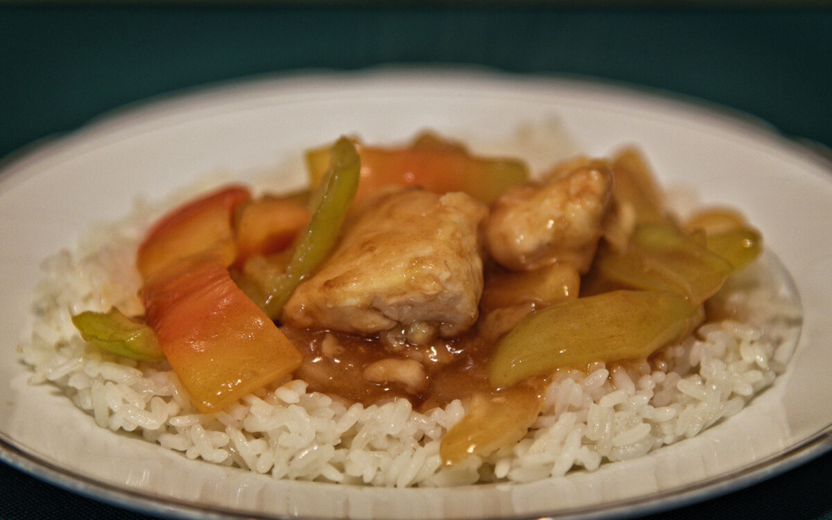 Необходимые ингредиенты: Грудку помойте, разделайте на 2 филе и нарежьте их маленькими кусочками. Перцы помойте, почистите и также нарежьте. Лук почистите и нарежьте тонкими полукольцами. Яйцо взбейте в отдельной миске, рядом поставьте миску с небольшим количеством крахмала. Разогрейте в сковороде немного растительного масла. Нарезанные кусочки куриной грудки посолите и поперчите, партиями обваляйте в крахмале, потом в яйце и обжарьте в сковороде до румянца, несколько раз перевернув. Готовую курицу сложите на отдельную тарелку. В отдельное емкости соедините растительное масло, уксус, соевый соус, кетчуп и сахар и все тщательно размешайте. В сковороду, где жарилась курица, добавьте немного масла и обжарьте нарезанный лук (5 минут). Добавьте к луку перец и кусочки ананаса (без сиропа, сироп сохраните). Жарьте, помешивая, 3 минуты. После этого влейте в сковороду подготовленный соус, перемешайте и готовьте на слабом огне еще 3 минуты. За это время соедините сироп от ананасов с 2 ст.л. крах