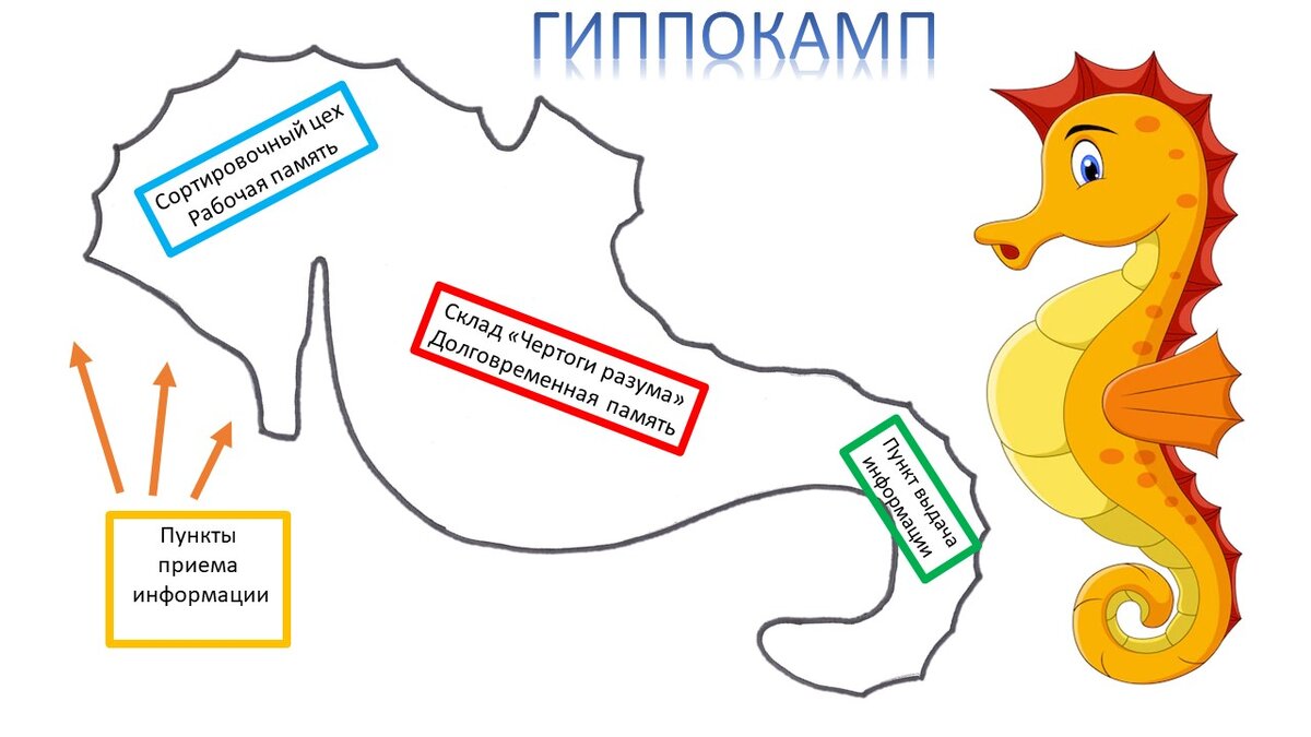 Заканчиваю рассказ про Гиппокамп (предыдущие части читайте здесь) – Пунктом выдачи информации. Собственно, это - самый главный отдел, ради которого все предыдущие действия и выполнялись, но, если весь процесс запоминания проходит достаточно долго, то выдача информации занимает долю секунды и выглядит следующим образом: при поступлении запроса сначала идет сигнал, что такая информация вообще на складе есть, а потом скан-образ – «микрошарик» передается по идущим над складом трубочкам, их также плетут Нейрончики, поэтому они так и называются – «нейронные сети». Наглядно, как это работает, разберем на примере. Представим себе ситуацию, что вы встретили на улице человека – вы понимаете, что его знаете, т.к. прошел сигнал, что информация о нем есть на складе. Потом начинается движение Нейрончиков по дорожкам, чтобы отыскать нужный отдел, полку и ячейку с ней: - отдел «Родственники» - мимо, - отдел «Коллеги» - мимо, - отдел «Соседи» - есть сигнал! Ищем полку – «Соседи по даче» - мимо,