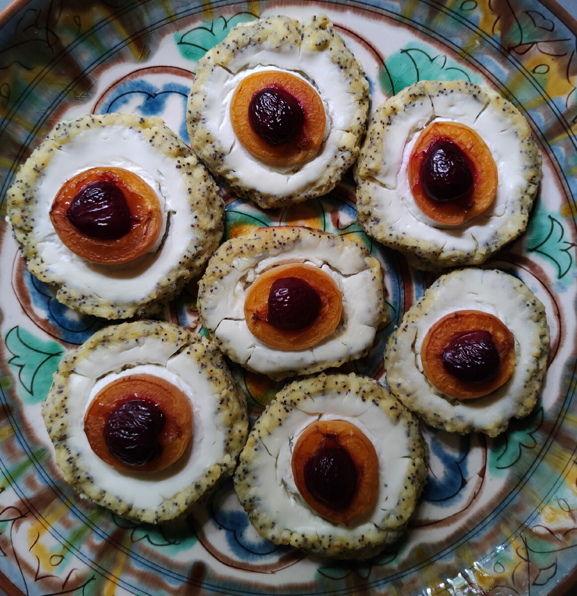 Приветствую вас! Сегодня хочу предложить вкусный и лёгкий в изготовлении летний десерт со свежими фруктами. Ингредиенты : Творог 5% - 200 г, 1 яйцо, мука рисовая цельнозерновая - 45 г, мак пищевой - 10 г, йогурт греческий - 140 г, цедра апельсина 1/2 ч.ложки, подсластитель, абрикосы и черешня - по 4 шт. Смешать яйцо, творог, муку, мак, немного подсластителя и цедру апельсина (цедру вместо теста можно добавить в йогурт). В греческий йогурт добавить подсластитель по вкусу (я обошлась без него). Абрикосы и черешню разделить пополам и вынуть косточки. Выложить тесто в виде блюдца с бортиками высотой 1-1,5 см на противень на бумагу для выпечки (но лучше силиконовый коврик на решетку, у меня бумага немного прилипла). Внутрь "блюдца" положить греческий йогурт , сверху украсить фруктами. Выпекать на 180 градусах примерно 30 мин. У меня маломощная духовка, готовила на 190 градусах около 40 мин. Результат понравился, ватрушки нежные и вкусные даже холодные, буду повторять. Получается 7-8 шт диам