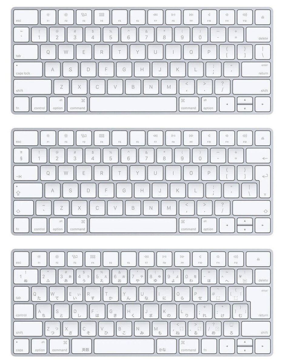 Сейчас у макбуков и отдельных эппловских клавиатур есть три типа раскладок: ANSI, ISO и японская. Японская раскладка предназначена для Японии. ANSI для США, Китая, Кореи и Таиланда. Остальные раскладки стандарта ISO, часто известного как международный английский или британский. Русская раскладка тоже ISO.