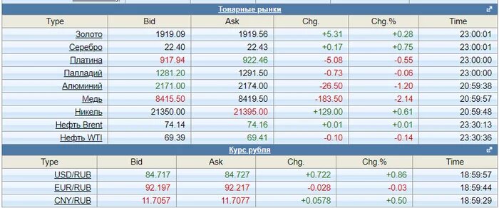 Товарная и валютная биржа. Изрядно упало золото... Рубль выглядит опечаленным. Нефть перестала падать. Urals (по трём источникам) - 53,88/58,76/56,35. Газ ТТФ - 378. Биткойн - 30868. Вырос. Индекс ММВБ - 2795. Чуть припал.