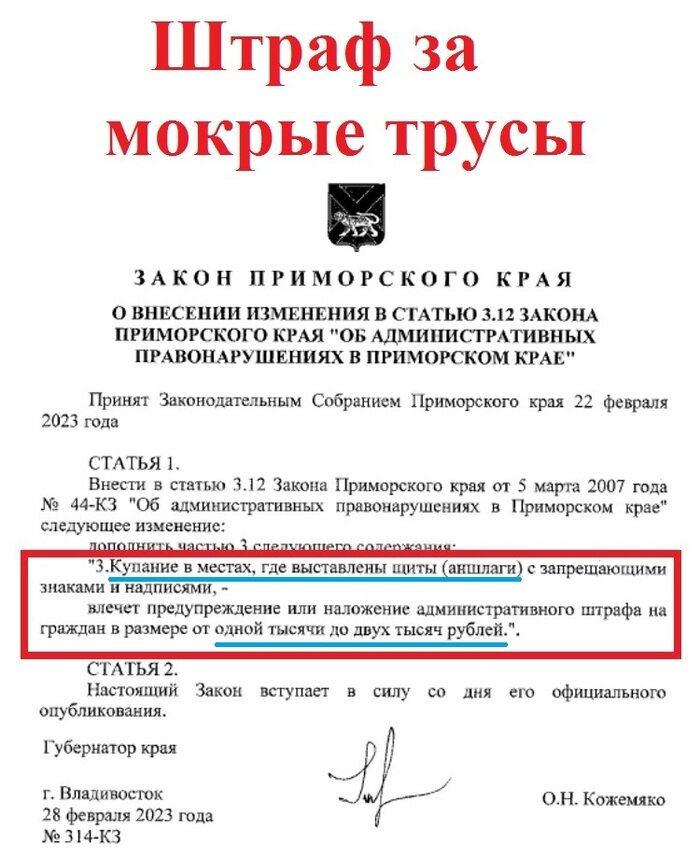 Напоминаю жителям и гостям Находки о том, что этой зимой, 28 февраля 2023 года, Губернатор Приморья подписал Закон о штрафах за купание в неустановленном месте. В соответствии с данным Законом, если человек купается на пляже, где установлен щит (аншлаг) с запрещающими купание надписями и знаками, то этим своим купанием он совершает правонарушение, за которое может быть легко и просто оштрафован сотрудниками полиции/росгвардии на сумму от 1 до 2 тысяч рублей. В случае, если вы пришли загорать на пляж, где установлен аншлаг, запрещающий купание - рекомендую брать с собой ведёрко и когда/если вам станет жарко - обливаться морской водой, предварительно наполнив ведёрко, дабы не получить тепловой удар от пребывания на солнце. Помните, что на пляжах, где размещены такие аншлаги - нет мед.пункта с необходимыми средствами первой неотложной помощи, а значит единственное, что может уберечь вас от теплового/солнечного удара - ведёрко с водой. Советую так же при составлении протокола о купании в н