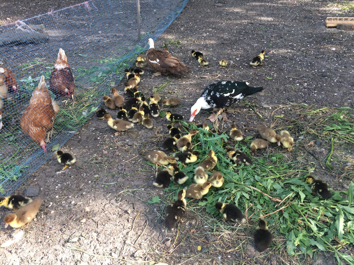 Прибавление в рядах индоуток практически подошло к завершению. Наши утки наседки хорошо справились с ответственным делом - высиживанием и стали мамашками. Вылупление у всех происходило по очереди, так как они неслись в одно гнездо потом кто-то садился высиживать, остальные находили новое место и продолжали яйцекладку. На данный момент только одна уточка сидит в гнезде, две уточки ещё несутся, остальные пять водят по выгулу большую группу молодняка от нескольких дней почти до месяца.