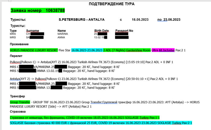 Номер заявки, отель, кол-во ночей, трансфер и страховку от невыезда выделила зеленым цветом.