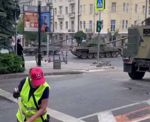 Работник коммунальной компании вышла на смену в центре Ростова. В Ростове дворники приступили к уборке улиц у штаба ЮВО на фоне танков. Видео уборки опубликовал паблик «Ростов Главный». Помимо дворников на улицах замечены вооруженные люди. Губернатор Василий Голубев дал особые поручения службам обеспечения Ростова из-за ситуации в городе. «Дал необходимые поручения ростовской городской администрации и службам жизнеобеспечения Ростова принимать необходимые меры по сохранению нормального функционирования всех городских систем», — сообщил губернатор. Голубев попросил ростовчан без надобности не покидать дома и не приезжать в центр донской столицы. Обстановка в городе остается спокойной, но была замечена крупная боевая техника неподалеку от штаба СКВО. Газета «Известия» сообщила, что это танки. Город, а также выезды из него, якобы перекрыты, сообщили очевидцы. Глава ЧВК «Вагнер» Евгений Пригожин записал аудиообращение, в котором заявил, что якобы «входит в Ростов». Об этом сообщила радиост