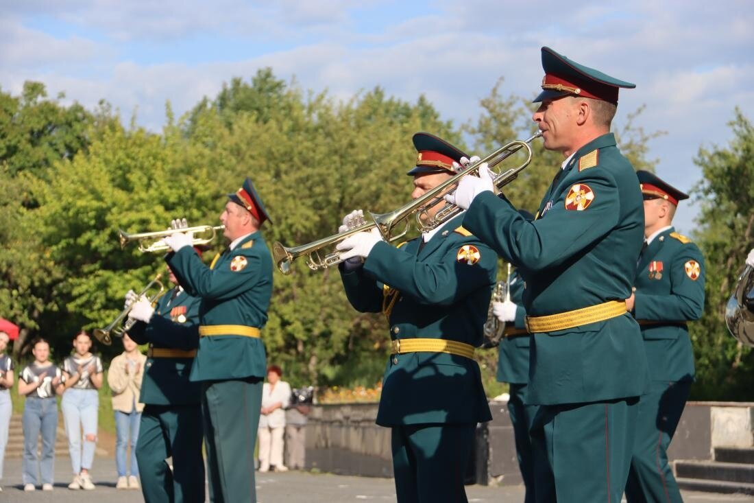 Достигнув одной из главных площадей города, военные музыканты подарили выпускникам концертную программу, в которую вошли классические и современные произведения, чтобы быть с ребятами «на одной волне».