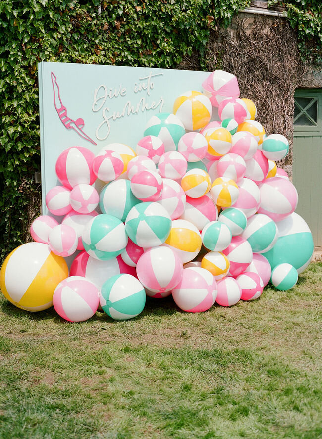Красочные вечеринки заслужили не только дети, но и взрослые! Нам очень нравится находить примеры яркого декора на взрослых праздниках. Например, эта пати у бассейна с невероятной фотозоной! Вместо воздушных шаров фон украсили надувные мячики для пляжа — сочные розовый, мятный и жёлтый цвета. Праздник устроили на территории загородного отеля-ресторана, так что это сразу сняло проблемы с поиском большой территории и подрядчика для закусок. Всё это отель взял на себя, а декораторы занялись обустройством пространства. В бассейн запустили надувные круги в форме сердечек, украшеные живыми цветами, на берегу готовился к концерту джаз-бэнд, а гости наслаждались ледяной маргаритой! В сервировке стола соблюдали гамму праздника: обилие розового цвета, живые цветы, жёлтые и зелёные акценты. А ещё для гостей подготовили подарочные сумочки, так что таким можно баловать не только детей 🙂 Все получили стильные пляжные сумочки из пластика с полотенцами, солнечными очками, сладостями и другими мелочам