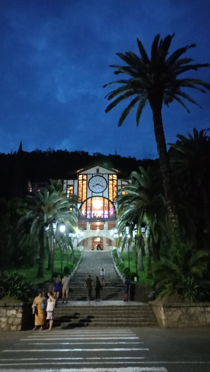 Вечером по темноте мы гуляли не ежедневно. Хотя там по набережной так красиво и безопасно гулять. Но мы за день так "упëхивались", да и вставала я, каждое утро в шесть утра, что уже вечером сил и желания не всегда хватало. Очень хотелось спать и отдыхать. Но всё же несколько таких прогулок было. О некоторых я уже вам рассказывала и фото показывала : О других его расскажу (может быть). А сейчас хочу рассказать об этой- когда мы вчетвером сходили и посмотрели на ресторан "Гагрипш". Он является одной из визитных карточек Гагры. Легко узнаваем. Красиво выглядит днëм, а вечером - сказочно! Этот деревянный дом с часами был изготовлен в Норвегии. Доставлен в Гагру разобранным. И собран без единого гвоздя в 1902 г. (прямо абхазские Кижи). Купил его конечно же принц А. П. Ольденбургский- основатель курорта. Купил на Всемирной выставке в Париже! 9 января 1903 года в этом ресторане и было торжественно отмечено открытие курорта Гагра! Значит ресторану уже исполнилось 120 лет! Хорошо выгля
