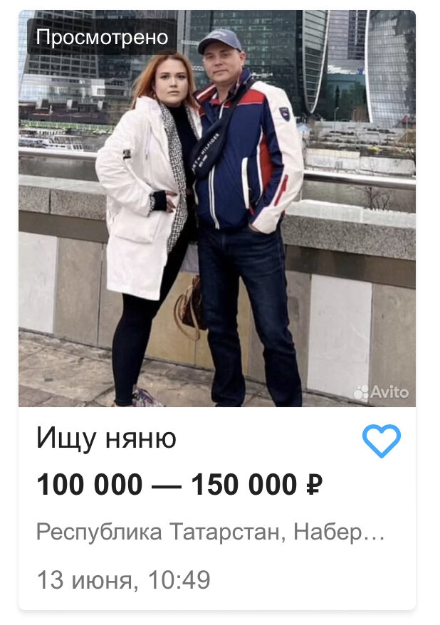 Жительница Набережных Челнов разместила объявление о поиске няни с зарплатой 150 000 рублей. Однако помощница нужна не для ребенка, а для её мужа. В описании вакансии сказано, что работать необходимо с 8:00 до 20:00, и среди обязанностей прогулки на свежем воздухе с мужем, игра в бильярд и компьютерные игры, просмотр хоккейных матчей вместе, приготовление пельменей и напитков. Также “няне” требуется говорить комплименты мужу и поддерживать его увлечения. Кандидат должен знать анекдоты про Вовочку, песни Михаила Круга и группы “Воровайки”, ориентироваться в хоккейном сезоне. Журналисты связались с соискательницей и она объяснила, что ее работа забирает много времени, поэтому она не может заботиться о своем муже должным образом.