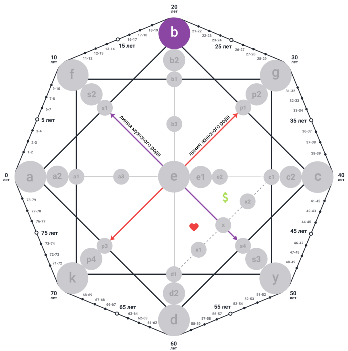 Точка a, визитная карточка, отвечает за ресурс человека, самая ярко проявленная и позитивная энергия. Именно по ней нас видят люди. Если энергия в этой точке в позитивном проявлении, то вы понимаете свою самоценность, вы понимаете кто вы и зачем живёте. Точка b, отвечает за талант данный богом, если их проработать, то можно замечать подсказки вселенной. Обычно они всегда в плюсе, но это начальный этап. Эту точку все равно надо прорабатывать. Точка с, отвечает за то, что нам надо сделать до 40 лет, в этой жизни именно эта энергия влияет на наше материальное благополучие, перекрывая тот самый "денежный поток". Его обязательно надо проработать. Точка d, это кармический хвост, нерешенные задачи в прошлой жизни.Его тоже надо обязательно проработать. Энергию в этой точке нужно стараться проживать в положительном проявлении, тогда мы будем чувствовать прилив сил, она дает мощный толчок для реализации масштабных проектов. Точка e, это точка комфорта, энергия в данной точке расскажет как мы вед