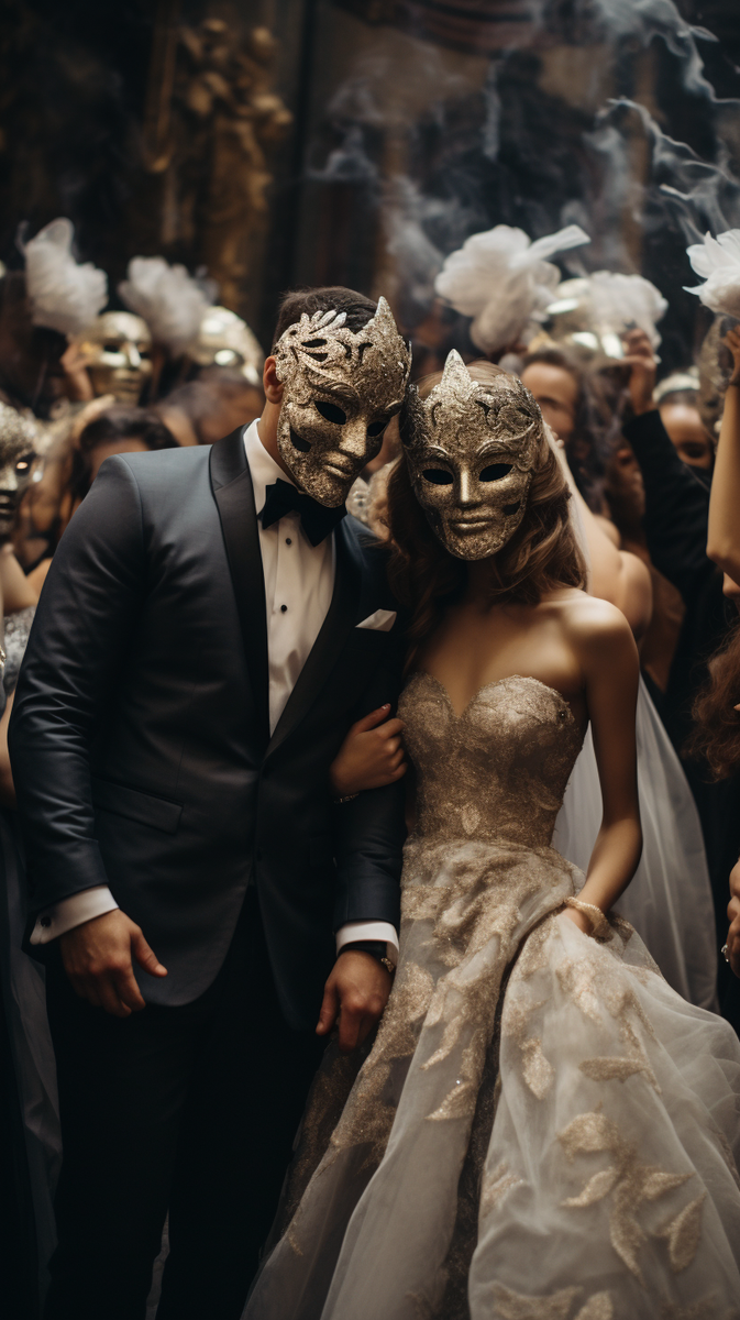 1. Встреча молодоженов с гостями в замке, где будет проходить свадьба. 2. Гости приглашены на свадебную церемонию в зале замка, украшенном в стиле маскарада. 3. Молодожены входят в зал под масками, держа друг друга за руки. 4. Свадебная церемония проходит с участием актеров, одетых в костюмы из эпохи маскарада. 5. После церемонии молодожены и гости отправляются на фотосессию в сад замка, украшенный фонарями и свечами. 6. Во время фотосессии гости получают маски и аксессуары для участия в маскараде. 7. После фотосессии гости возвращаются в зал замка, где ожидает их ужин. 8. Ужин сервируется на столах с пышными скатертями, свечами и цветами. 9. Гости развлекаются во время ужина с помощью актеров-аниматоров, которые проводят интерактивные игры и шоу. 10. После ужина начинается торжественное открытие танцевального пола. 11. Молодожены открывают танец под масками, после чего приглашают гостей присоединиться к ним. 12. В течение вечера проходят различные конкурсы и игры, связанные с маскарад