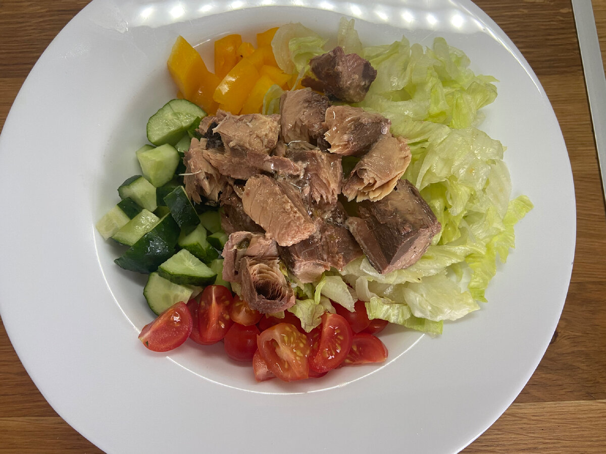 Для приготовления 2 порций нам понадобится: Для заправки: Овощи нарезаем соломкой или кубиками, салат и зелень шинкуем, яйца отвариваем. Сервируем все ингредиенты 50/50. Для заправки смешиваем все ингредиенты и поливаем сверху. Сверху украшаем зеленью и разрезанным яйцом. Приятного аппетита!