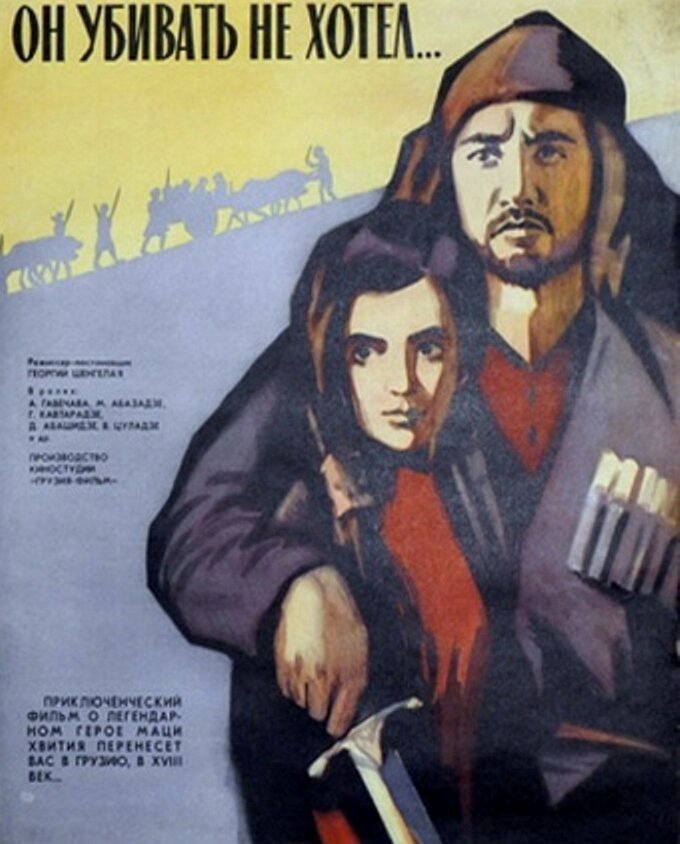 Он убивать не хотел. СССР, 1967. Режиссер Георгий Шенгелая. Сценаристы: Гурам Асатиани, Георгий Шенгелая (по мотивам романа А. Пурцеладзе "Маци Хвития"). Актеры: Алеко Габечава, Манана Абазадзе, Георгий Кавтарадзе, Давид Абашидзе, Георгий Геловани, Кахи Кавсадзе, Зураб Кипшидзе и др. Прокат в СССР – с 12 июня 1967: 18,6 млн. зрителей за первый год демонстрации. Режиссер Георгий Шенгелая (1937-2020) за свою карьеру поставил 13 игровых фильмов, многие из которых вошли в «золотую коллекцию» советского «авторского киноискусства»: «Пиросмани» (1969), «Путешествие молодого композитора» (1984) и др. Большинство его картин отличалось изысканным изобразительным решением и философской глубиной. Его работы нередко получали призы на кинофестивалях, но заметного зрительского успеха, как правило, не имели. «Он убивать не хотел» – единственный фильм Г. Шенгелая, которому удалось войти в тысячу самых кассовых советских кинолент. Действие этой истории о благородном грузинском разбойнике происходит в XV