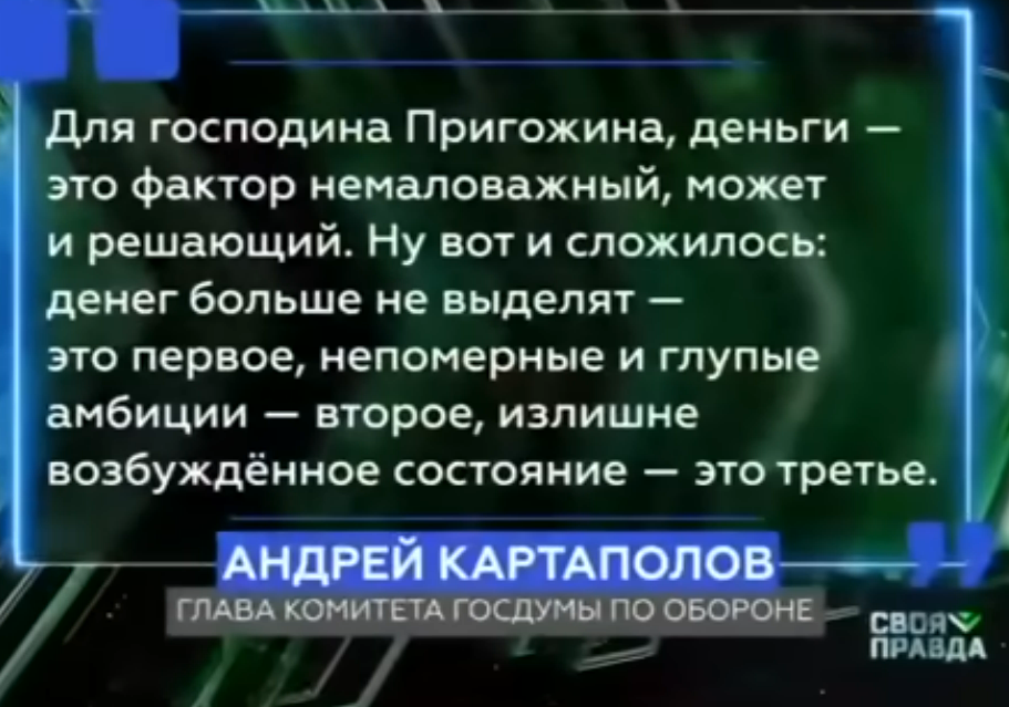 - Я слава Богу не живу в голове у Пригожина, наблюдаю со стороны. Могу предположить, что это - амбиции, деньги, психотип. Даже, наверное, в первую очередь, определенный психотип. Личные обиды... Всё вместе, когда человек просто идет ва-банк. ... Он точно не идиот. Но не считаться с тем, что это разрушает его Родину, за которую он бился, проливал кровь (крошечная пауза) своих бойцов!.. В голове у меня не укладывается, Ром. В голове не укладывается. Я знакома с Пригожиным. Много лет знакома. Мне до сих пор в это трудно поверить, понимаешь? А я думаю, что Президенту нашему еще труднее.