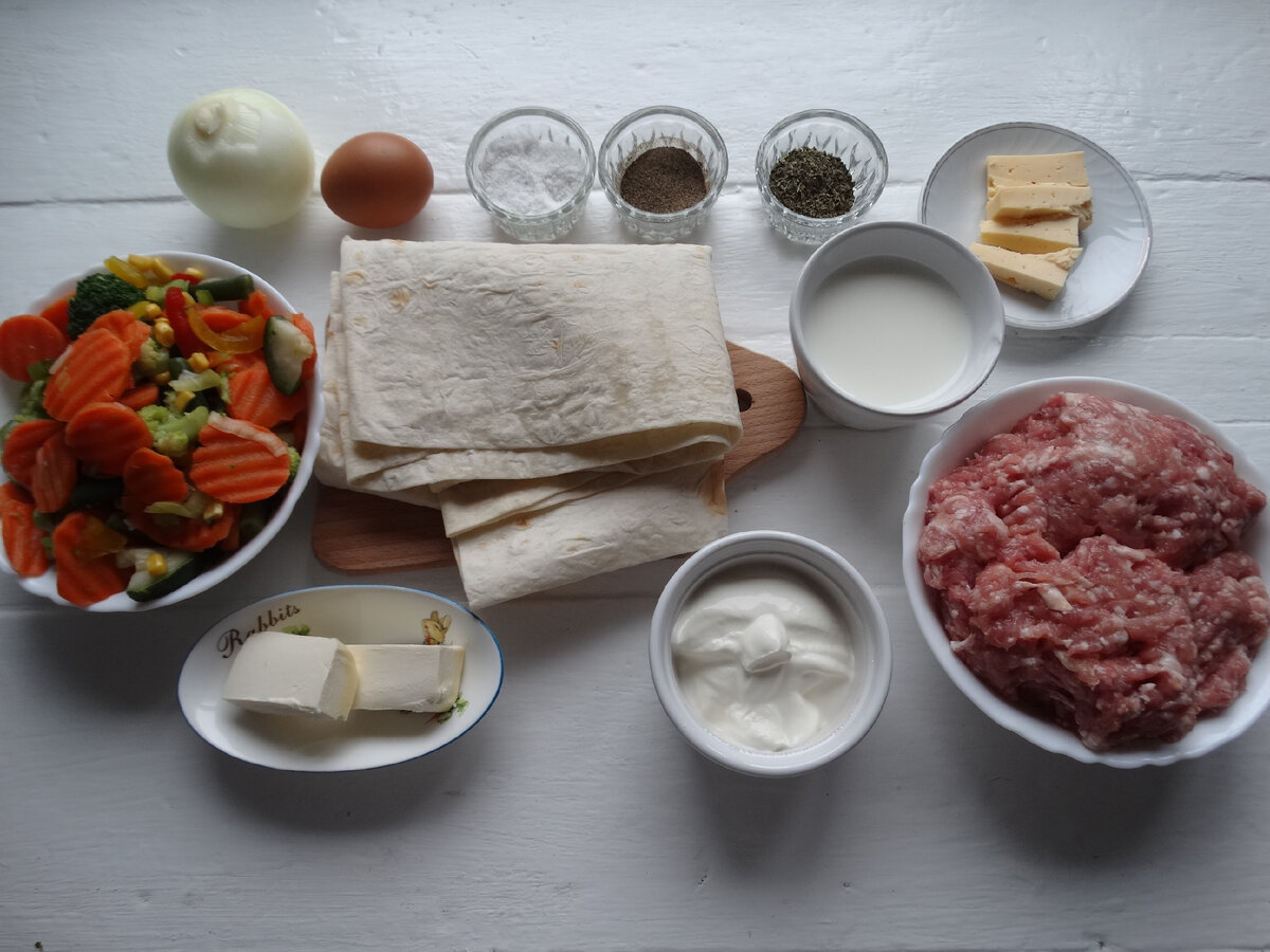 Такой пирог из лаваша с двойной начинкой я готовлю, сколько себя помню. Он даже чем-то напоминает лазанью в моем исполнении. Вот только времени на этот пирог уходит минимум, ведь не нужно готовить 2 соуса: бешамель и болоньезе. Этот вариант мясного пирога реально шустрый. Я даже для него специально или сама нарезаю и замораживаю, или покупаю готовую замороженную овощную смесь.
