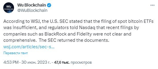 Заявления на спотовые биткоин-ETF, по сообщению WSJ, были недостаточными, что было сообщено регуляторам NASDAQ. BlackRock и Fidelity не представили четкие и исчерпывающие заявки, и SEC вернула документы. Это крайне негативная тенденция, так как первые заявки начали отклоняться. Возможно, хотя бы одна заявка будет принята? Кроме того, из-за исков SEC, Revolut делистит Cardano, Polygon и Solana.