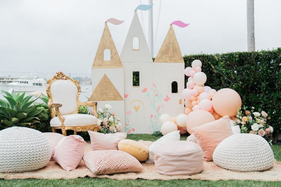 Коллекция Meri Meri с принцессами и единорогами вдохновила уже на множество красивых праздников! Но посмотрите на эту красоту — вечеринка на улице около океана, такого мы ещё не видели 🙂 Для двух сестричек-именинниц оформили столы на улице для чаепитий, а на полянке у дома поставили роскошный трон, разложили пледы с подушками и изготовили макет замка, расписанный вручную. Девочек нарядили в костюмы Авроры и Золушки — они были не только в прекрасных платьях, но и смогли почувствовать себя любимыми героинями сказок. На выходе из дома расставили нежные розовые стульчики, а на столе расположилась волшебная посуда Meri Meri, букты цветов и сверкающие колпачки. А отдельно стоял столик для поделок — тут девочки могли создать свою собственную корону, украсив её стразами. Даже самые маленькие легко справились с этой задачей! В доме был кейтеринг для детей и взрослых: круассаны, овощные салаты, необычные сэндвичи в форме звездочек, тарелки фруктов и стаканчики с хумусом и овощами. Их украсили