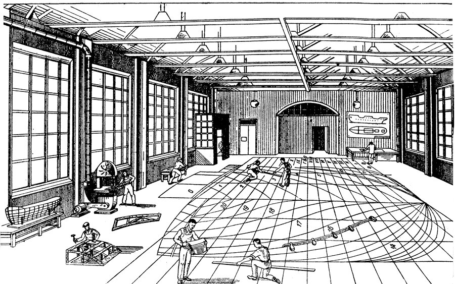 Берут теоретический чертеж судна, и, в большом помещении, на специально подготовленном полу начинают чертить в натуральную величину растяжку обшивки, обводы для шаблонов. Потом, по растяжке обшивки начинают делать раскрой металла (в зависимости от размера поставляемого листа), при клепаном корпусе нужно сделать еще припуски на «нахлест». Там много тонкостей. Работа эта сложная трудоемкая, и требующая очень высокой квалификации. Любая «плазовая ошибка» стоит достаточно дорого «ткани» может не хватить, ее придется дозаказывать, дозаказ идет только партией и.т.д.
