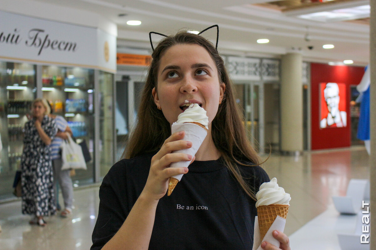 В Минске уже не первую неделю выстраиваются длинные очереди за кобринским мороженым в ТЦ "Столица". Realt решил узнать, почему люди и в будни, и в выходные стоят в этой очереди. Что же такого в этом мороженом? Рассказываем. Автомат по выдавливанию мягкого кобринского мороженого находится на нижнем уровне ТЦ "Столица", рядом с магазином «Любимый Брест» и KFC. Когда мы пришли очереди почти не было, но за пару минут набралось человек 10. Тут и там уже сидели довольные люди с мороженным в руках. Ангелину привела сюда подруга, они пробовали это мороженое впервые. Девушка говорит, что очередь была небольшой, поэтому и решили купить. Пломбир ей понравился, но расстроило, что нет разнообразия вкусов. ー Люблю мороженое и хотелось попробовать что-нибудь новое. Сразу почувствовала насыщенный молочный вкус. Еще мне показалось, что чувствуется вкус сгущенки. Консистенция похожа на сметану, это необычно. Я никогда не пробовала именно мягкое мороженое. Наверное, оно очень калорийное, потому что я си