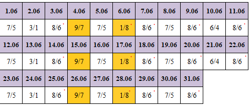 Обратите внимание на количество дней с задачами 8/6 и 1/8 в июне.