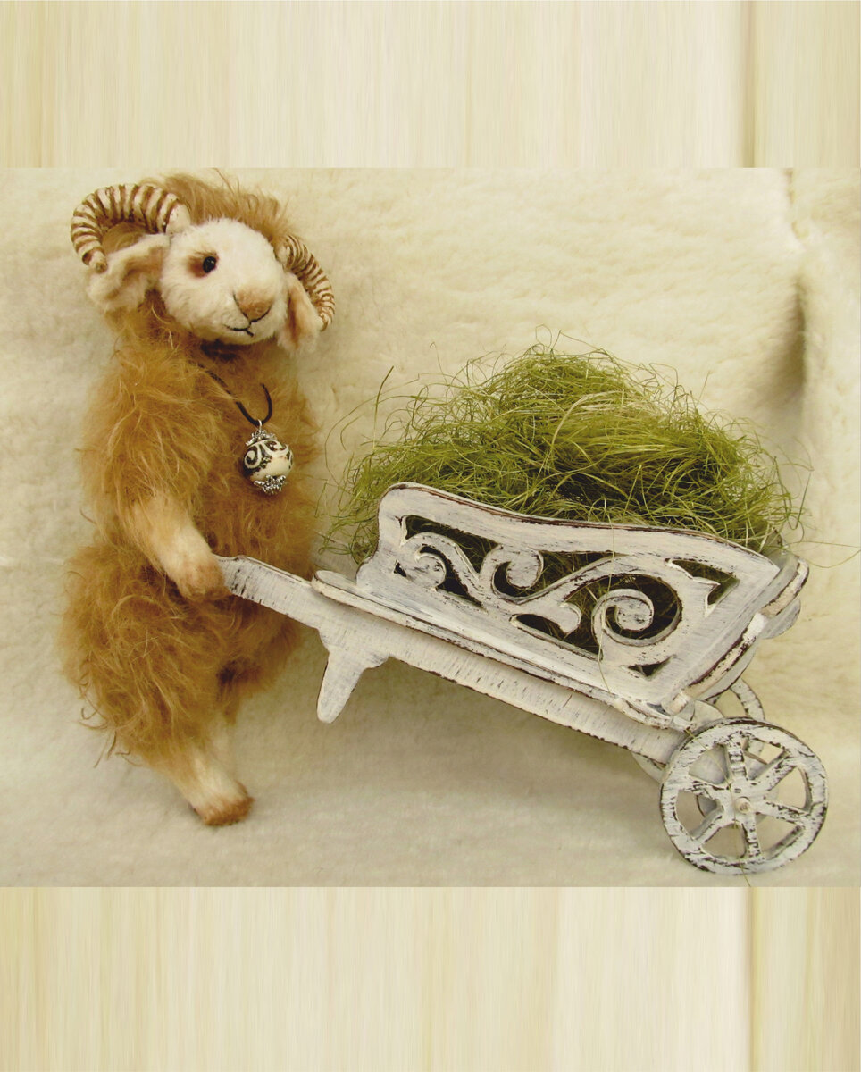 Рост - 19 см. Материалы - мохер и вискоза, тонировка маслом, рога- паперклей. Тележка - фанера, акриловая краска, лак. Мистер Баран победитель конкурса " Потап I " в номинации " Друзья-приятели".