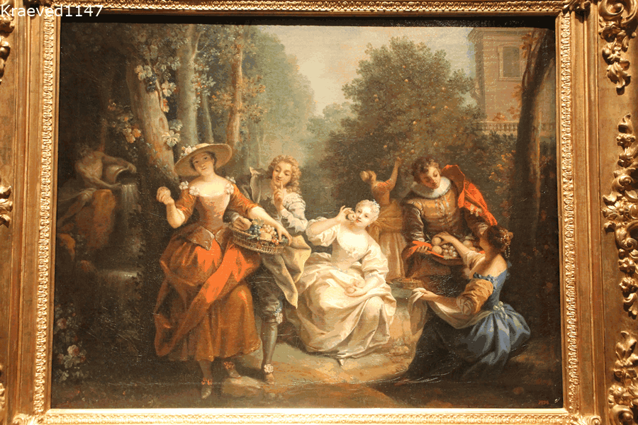 Помните, рассматривали интересную тарель с символическим изображением пяти человеческих чувств, которая хранится в Оружейной палате Московского кремля? Русские эмальеры выполнили вышеупомянутую тарель в XVII веке. К подобному сюжету обращались и западные мастера и тоже в XVII столетии или немного позже. Один из таких мастеров - француз Жан Рау. В Пушкинском музее изобразительных искусств сохранились две его картины, "Обоняние" и "Вкус". Подозреваю, что Жан Рау изобразил и другие чувства. Но в Пушкинском я увидела только два. Вкус Пышно одетые по барочной моде дамы и кавалеры предвкушают наслаждение плодами. Дама на переднем плане в шляпке и буро-коричневом платье предлагает нам попробовать ароматное яблоко. А кавалер потихоньку утаскивает из её корзинки фрукт. В центре полотна мадемуазель всем видом показывает, как ей нравится благоухание плода и она вот-вот откусит сочный фрукт. Да дальнем плане, обратите внимание на сцену "сбор фруктов". А что же происходит в правой части? Я об