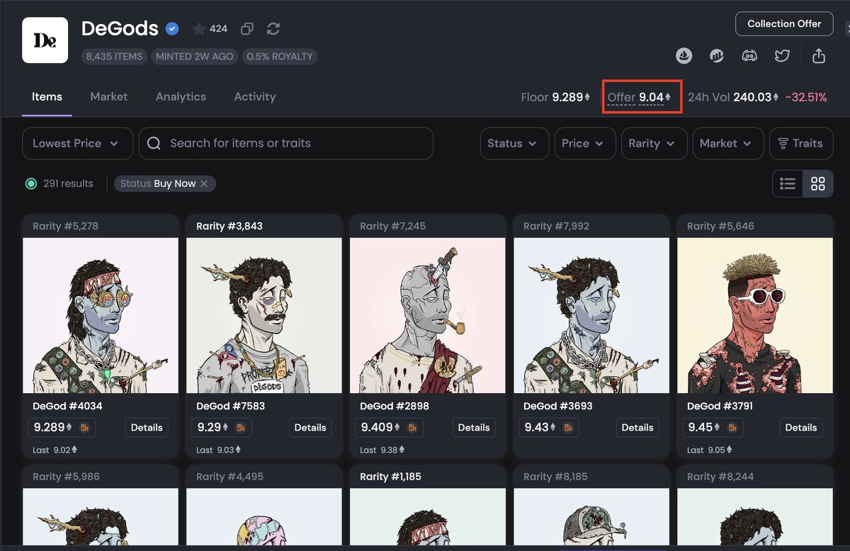 Продолжаем рубрику словарь Бид(collection bid/offer, instant sell) - ставка, мгновенная сделка Вы, как покупатель, делаете ставку и вам прилетит ЛЮБАЯ(важно) NFT из коллекции Если продавец принимает ставку, то НФТ уходит в самый высокий Бид, стандартный аукцион Пример из жизни: Грубо говоря, вы желаете купить любую квартиру в Минске за 30к$, не зная, какая она будет, просто готовы заплатить за любую С обратной стороны, вам нужны средства прямо здесь и сейчас и продаете ее тому, кто больше даст в данный момент Кто сливает свои NFT в бид? - Paperhad'ы, паникеры, одним словом, чаще всего причина сложно объяснима😁 - Кому срочно нужна ликвидность для другой сделки, иногда это очень smart - Трейдеры, который выцепили НФТ из это коллекции ранее по Биду дешевле чем текущая ставка Часть для 🐳🦈🦀 Многие ставят бид и просто верят, что им прилетит хорошая НФТ, которую можно дорого продать Но я всегда закладываю, что, в лучшем случае, прилетит нормальный флор или уродец с high Pts Лично мне прил