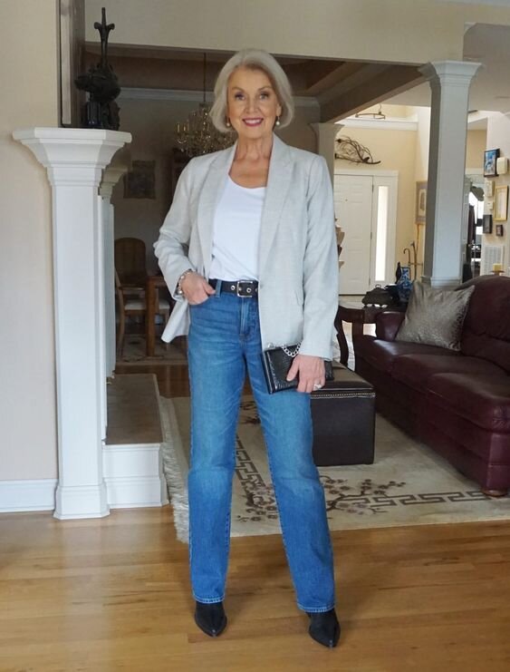 - Если вы носите джинсы, то всегда будете выглядеть современно. Джинсы выбирайте самые обычные, классического покроя, без декора. Такая модель идеально подходит для составления самых разных комплектов. В примере к ним добавили простую белую майку и классический светло-серый пиджак. К комплекту добавили чёрную обувь и клатч.