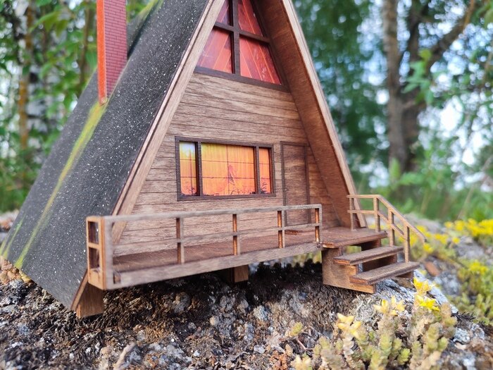 Ночник. Часть 1. Изготовление. Подразбавлю волну постов о работе рукоделием. Телега, если что, в профиле) В декабре 2022, сидел в командировке, в Ханты-Мансийске, написала девушка. Сделала заказ на набор для самосборки панельки-ночника, а далее что-то мы подразговорились. Дама оказалась общительная, эмоциональная и интересная) Ну и в диалоге проскочила тема: А потом я подумал: всё равно сижу один, вечером в съёмной квартире. Пить не сильно люблю. Знать я в городе никого не знаю. Займусь-ка я данным домом. Набросал несколько вариантов. Остановились на последнем. Ну а дальше по приезду домой было несколько заказов на готовые домики и другие проекты. Да и девушка видимо переключилась на что-то другое и отложила мысль про А-фрейм. А я таки решил собрать. Эпопея подрастянулась из-за командировок и других заказов, но так-как было не к спеху, делали в свободное время. Итак. Файл на резку ушел, после получение деталей. Хотел сначала добавить в середине А-шную конструкцию, для прочности, но пот