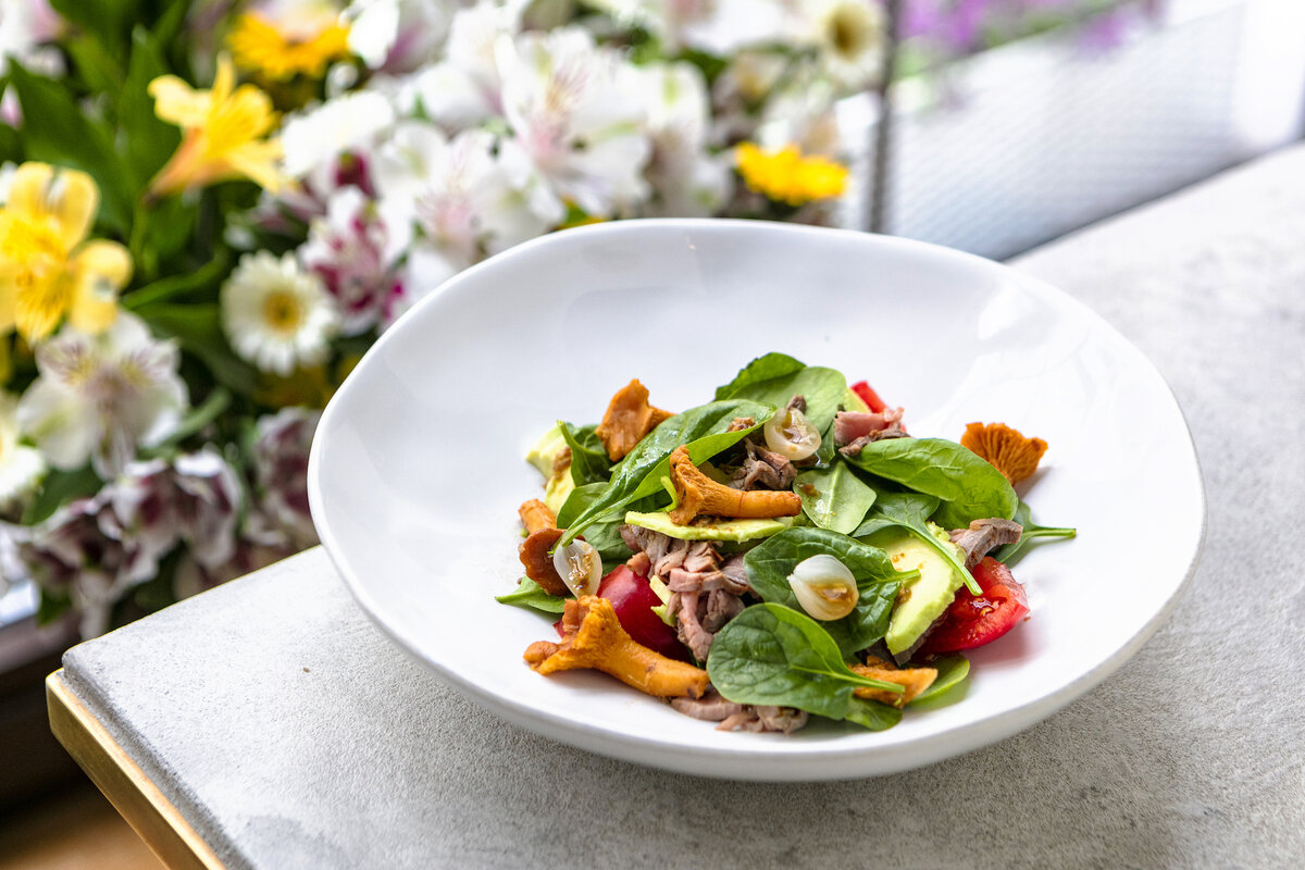 - Нарезать авокадо. Лисички полить соусом из грибного бульона. Соединить вместе все ингредиенты. Заправить салат соусом с кунжутным маслом.